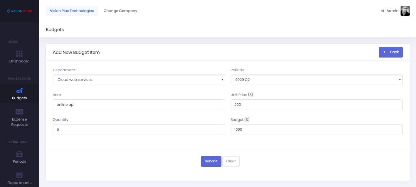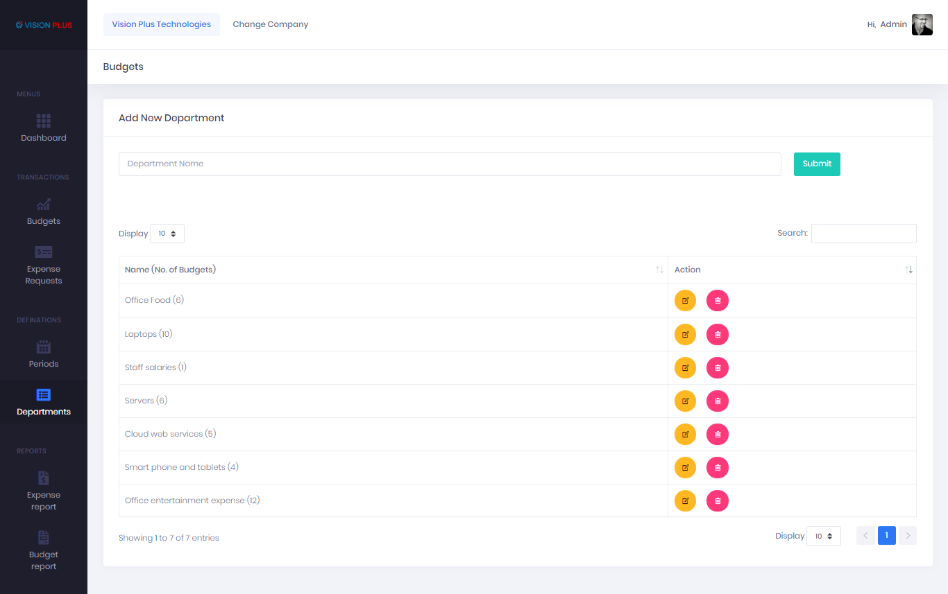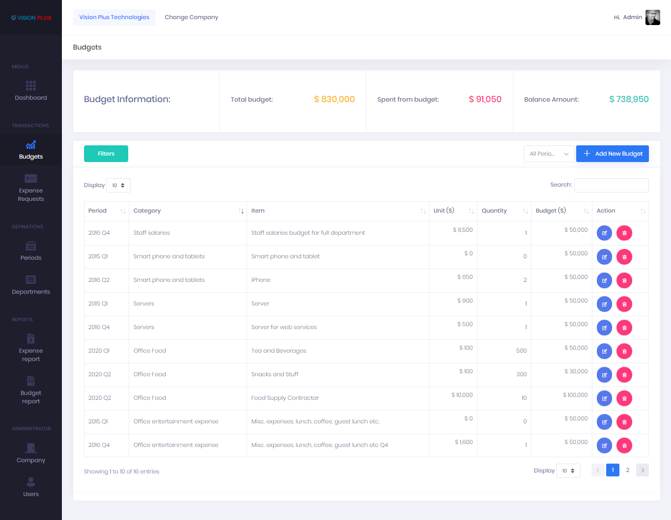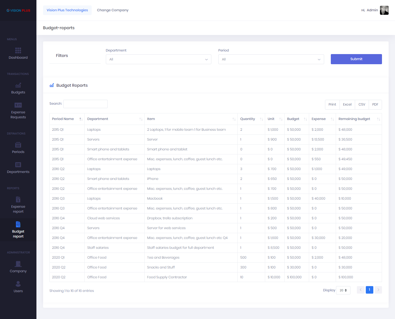 You can see all the budgets Period and Deparment wise including balance budget for each item, plus you have filter to see report for specific department or period.