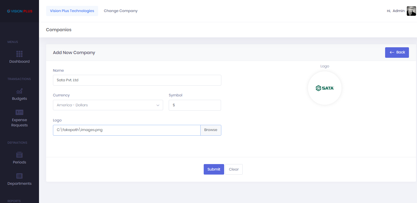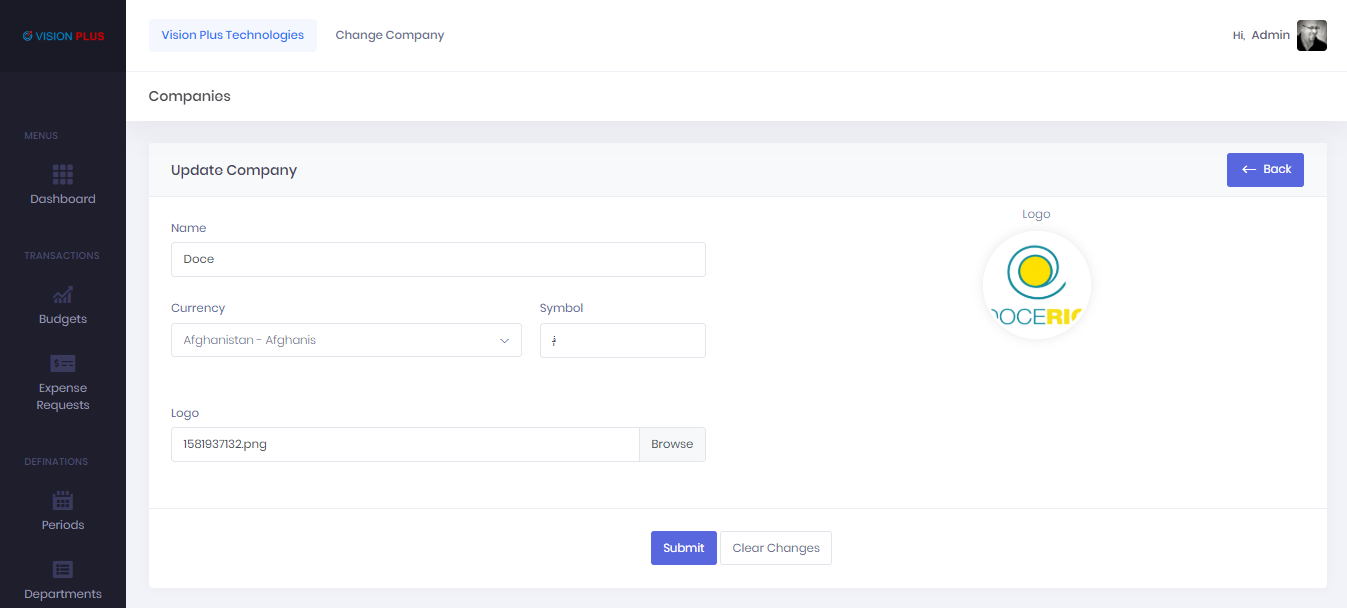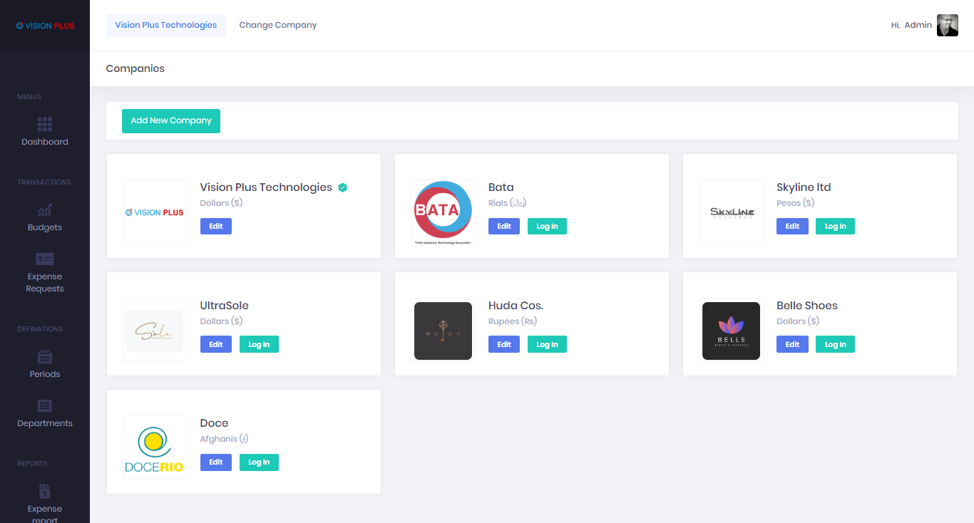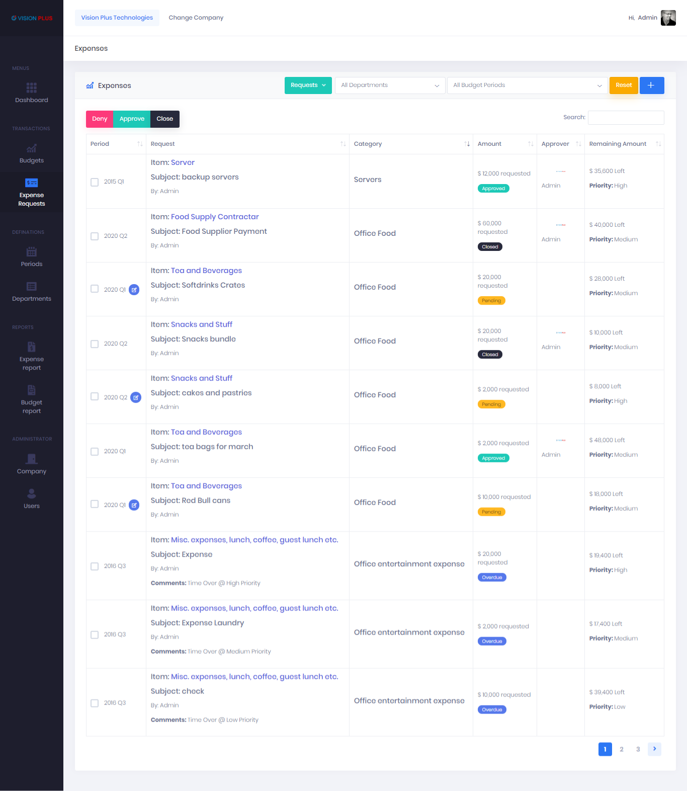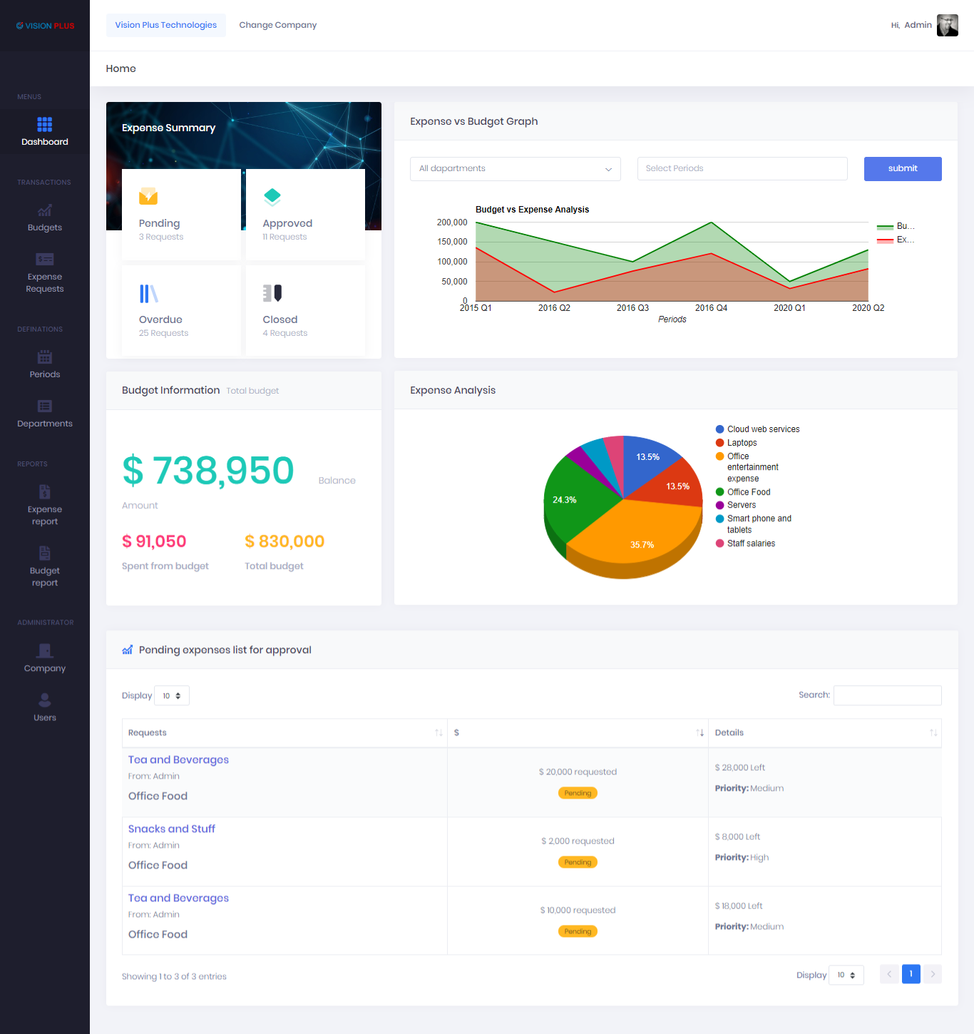 Dashboard and Landing page, user will land to this page after login. Also When user select any specific company, he will land to this page on which he can see listing of expenses related to particular company. He can approve, deny, close and overdue expense by clicking on status labels.He can see the budget vs expense chart and expenses comparison piechart