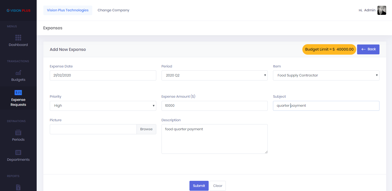 In this user can add expense for any budget whose department and time period is defined in Budget section: